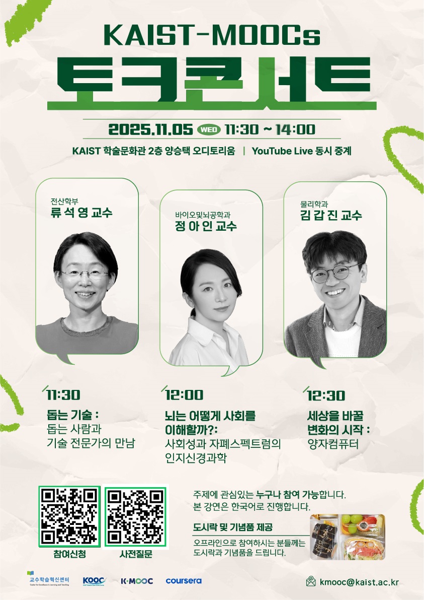 주제에 관심있는 누구나 참여 가능합니다. 본 강연은 한국어로 진행합니다. 도시락 및 기념품 제공 오프라인으로 참여하시는 분들께는 도시락과 기념품을 드립니다. 교수학습혁신센터 KOOC K-MOOC coursera kmooc@kaist.ac.kr " id="krcelt_0601_94" src="/_prog/bbs/?mode=D&site_dvs_cd=krcelt&code=0601&file_id=94" style="max-width: 100%; border-width: 0px; border-style: solid;" />